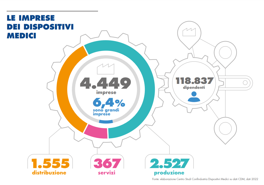 In Italia Confindustria MD dichiara in un report aggiornato al 1.1.2024: “Un giro d’affari di 18,3 miliardi di euro (+10%) tra export e mercato interno e 4.641 aziende (+20%), che occupano 117.607 dipendenti. Si tratta di un tessuto industriale molto eterogeneo, altamente innovativo e specializzato, dove le piccole aziende convivono con i grandi gruppi. Sono 2.749 le imprese di produzione che, insieme alle 1.531 di distribuzione e alle 361 di servizi producono o distribuiscono i dispositivi medici nel nostro Paese. Il tessuto imprenditoriale del settore è caratterizzato da una forte prevalenza di PMI (quasi il 94% del totale)”.